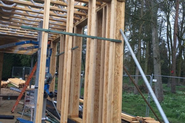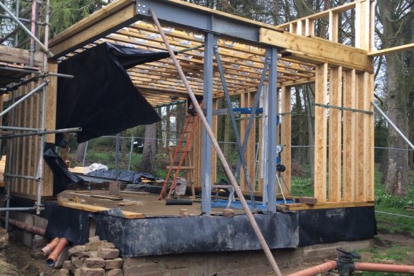 The extension comprised a timber frame superstructure with a large glazed corner windows. The timber frame was designed inhouse with Engineer I-Joists stud external walls clad with timber and metal clad roof over Engineered I-Joist Rafters. As a considerable proportion of the ground floor external walls were glazed, this posed a challenge with the overall stability. To overcome this, discreet steel bracing frames were hided within the timber frame walls to add the additional racking resistance required. The extension is linked to the original house with a glazed link. The house was refurbishment consisted of a new insulated timber frame over cladding the original masonry wall, new metal roof and a large glazed corner window.